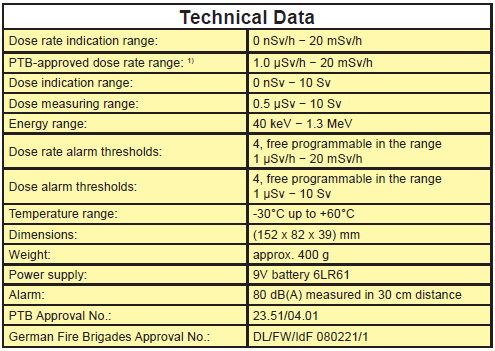 测量范围/剂量率/累积剂量 1.0 µSv/h -20 mSv/h/0 nSv-10 Sv